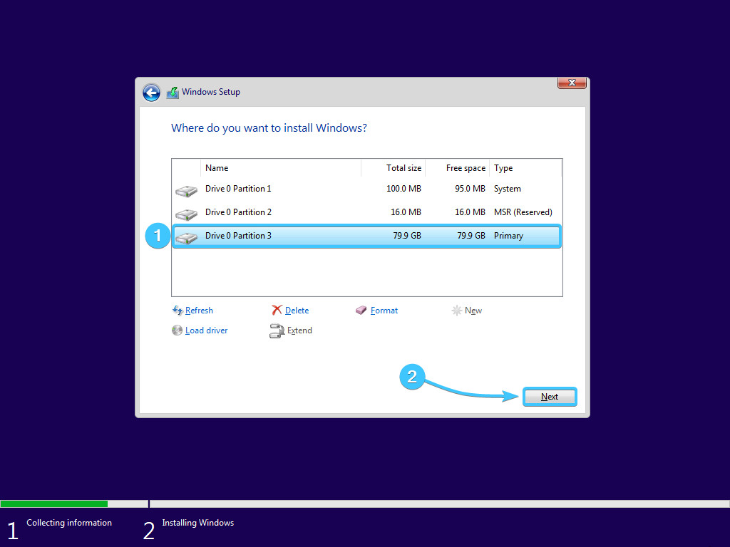 9. This will take you to the disc space partitioning menu. Unless you have a brand-new SSD or HDD, you will see more partitions than you would normally see in File Explorer. It is recommended to completely delete all partitions and determine how much unused space you will end up with. After that, you need to perform the partitioning of the disc space. It all depends on how many partitions you need. We recommend the following: one disc = one partition. If you have an SSD, you should install the operating system on it. Once the partitioning is complete, click on the partition where Windows 11 will be installed and click “Next”.