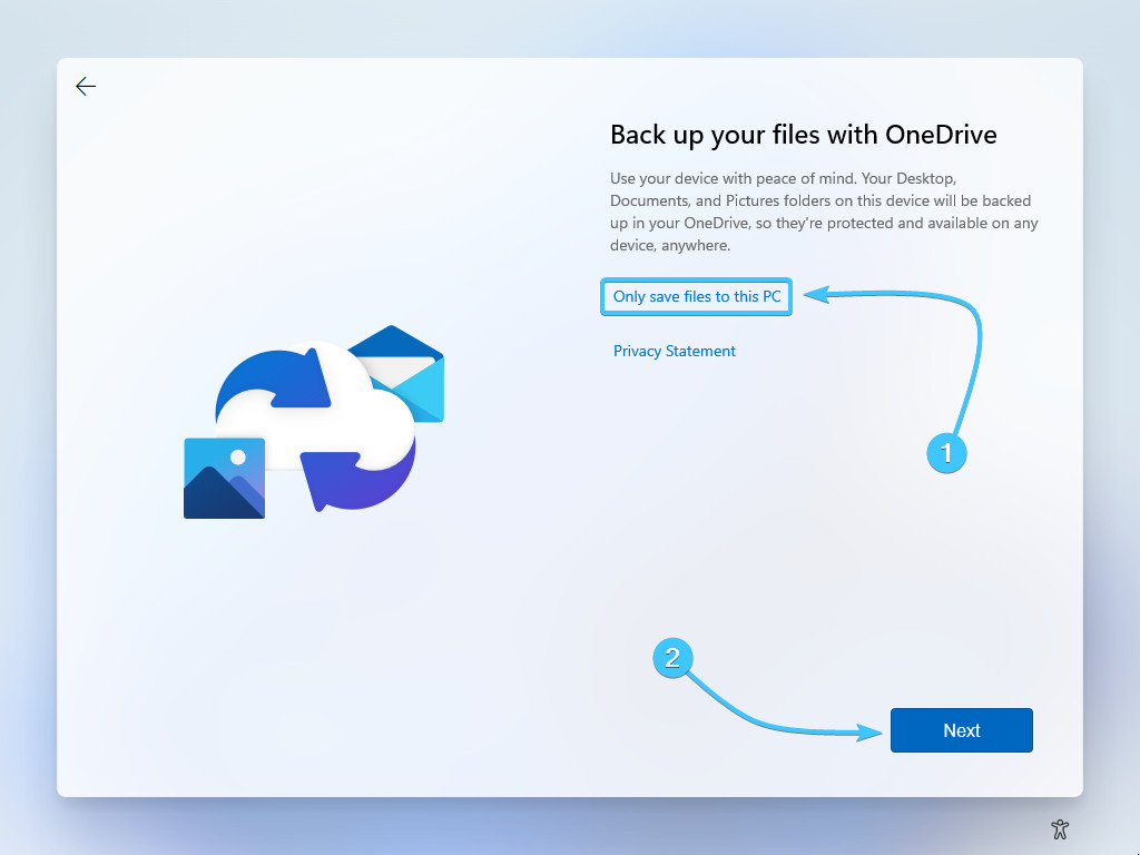29. Select the type of file backup. Click the “Next” button if you want to use “OneDrive”. If not, click the “Only save files to this PC” button.
