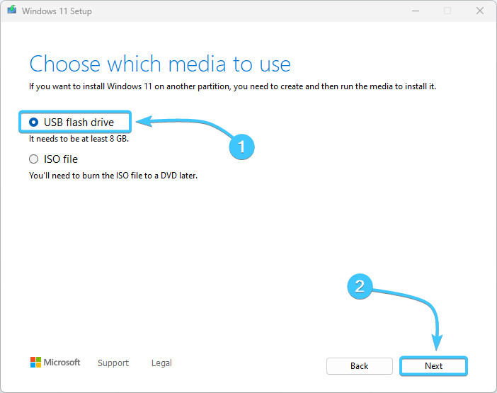 5. Insert the media into the device. Select “USB flash drive” and press the “Next” button.