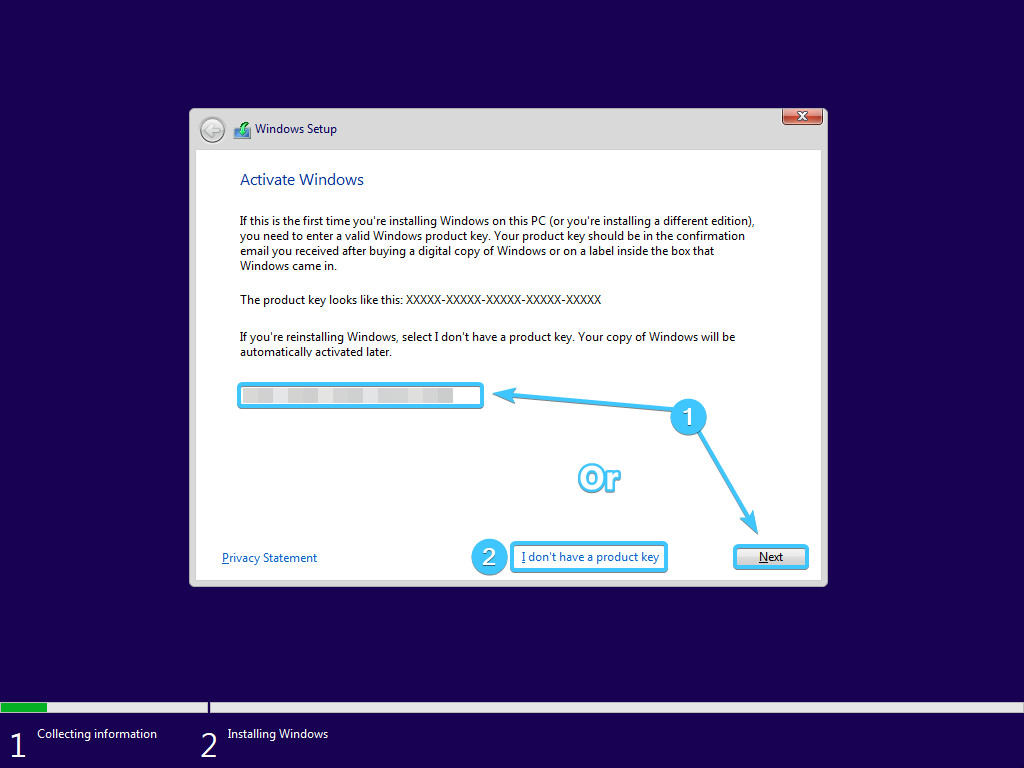 6. You will be asked to enter your product licence key. Do this if you have one, and click “Next” (1). If you do not have one, click the “I don't have a product key” button (2).