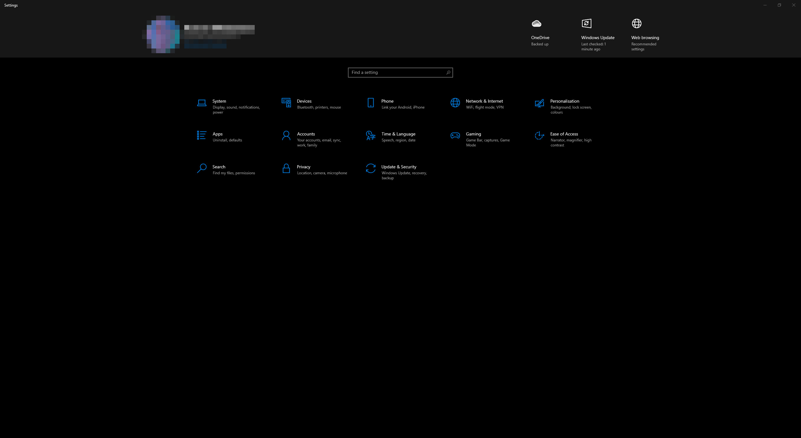 2. The general list of parameter categories opens. Open the “Update & Security” category.