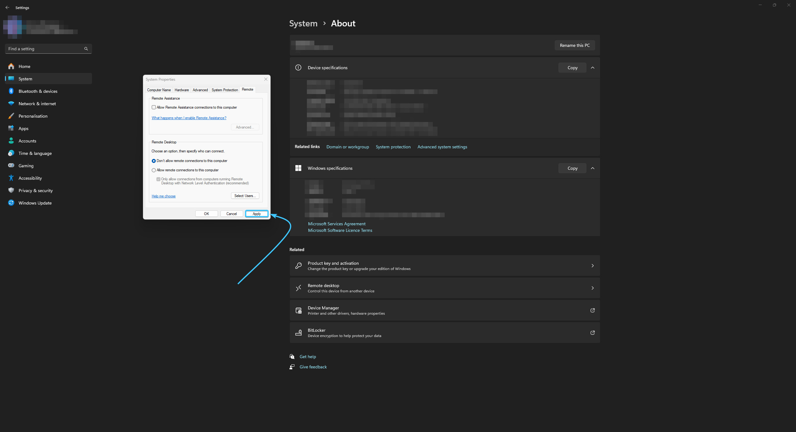 6. Uncheck the “Allow Remote Assistance connections to this computer” option.