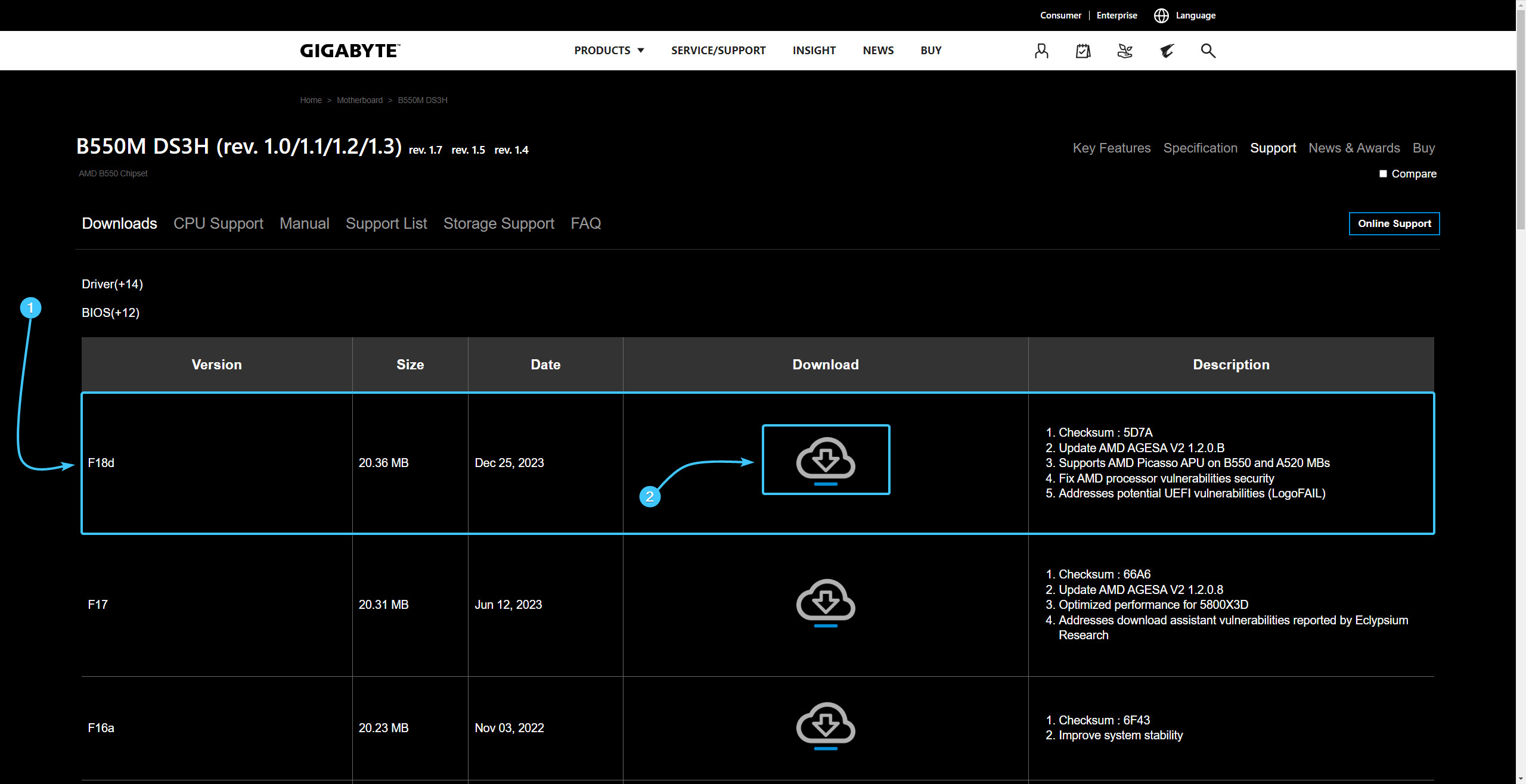 3. Open the subsection related to BIOS. Download the latest BIOS version for the device.