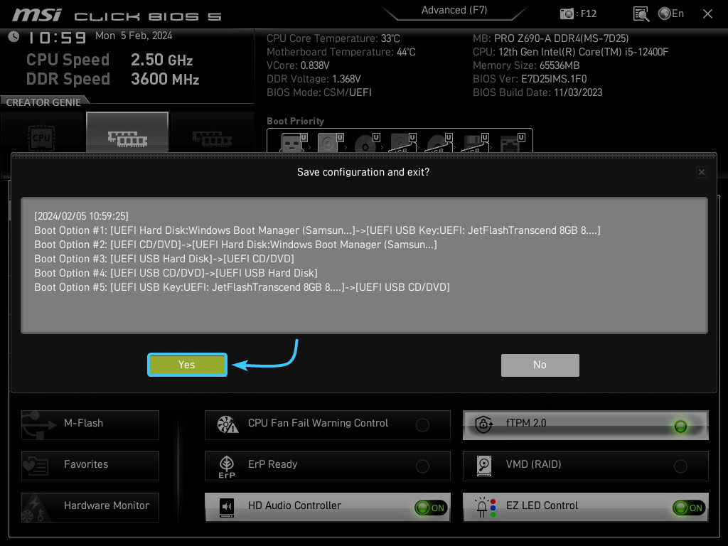 4. Press the F10 key on your keyboard. A confirmation window will appear, press the “Yes” button.