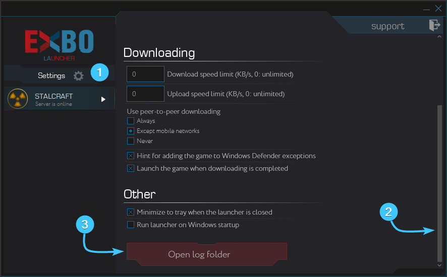 2. Open the “Settings” section and scroll to the bottom. Press the “Open log folder” button.