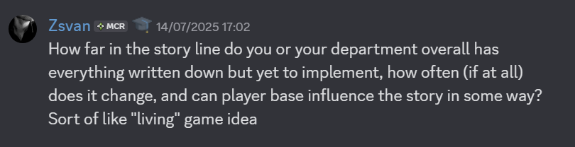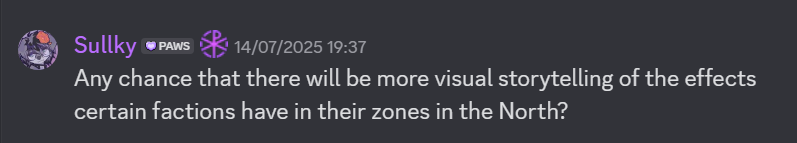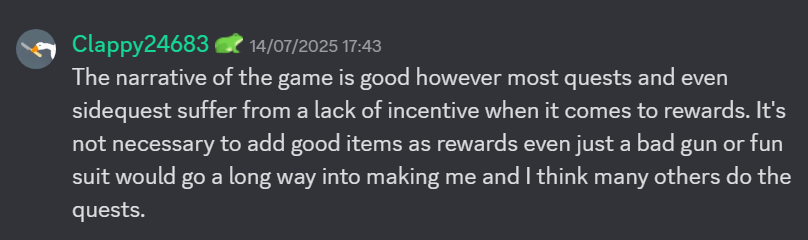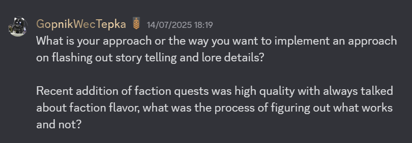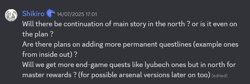 Frozen_Light: I don't want to talk about rewards. Since this is more about balance issues. But there are indeed plans to develop endgame quests. But first, we need to decide on the endgame gameplay. You can't create a good narrative without gameplay.