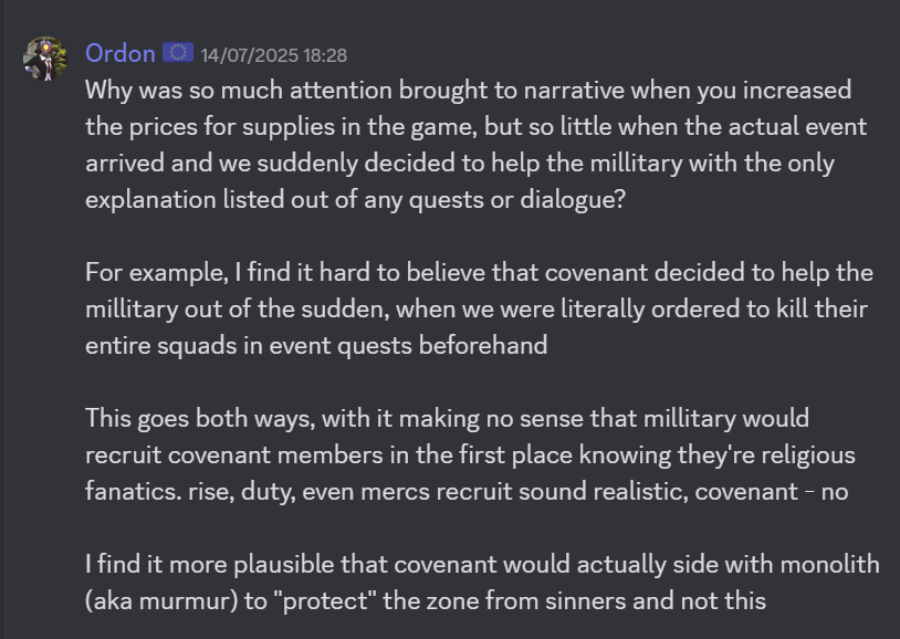 Frozen_Light: It is important to distinguish between preparation and the event itself.  The preparations affected the entire Zone and the entire Open World. It had to resonate with people and engage them, so many aspects of the narrative's impact were worked out and detailed. In turn, when the event directly related to military assistance began, the gameplay of the separate event took priority, so it was necessary to create a narrative that would complement the main gameplay without distracting attention from it. Again, did you listen to the propaganda of Murmur? In every word there is truth/form/essence/understanding.