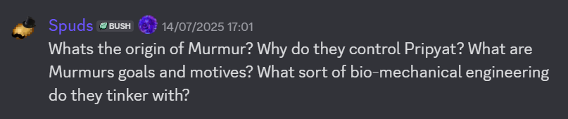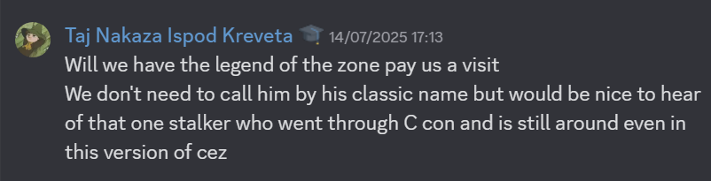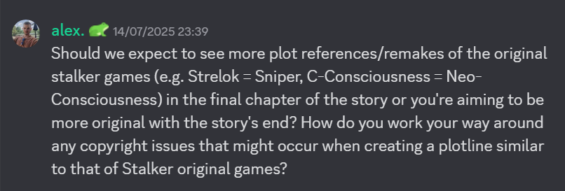 Frozen_Light: Let's start with the fact that we don't use Stalker's plot paths. Furthermore, references to original entities with altered names tend to have the status of legendary, semi-mythical events that almost no one remembers. Yes, some fan service will pop up one way or another, but in extremely homeopathic quantities. We have our own world, our own universe.