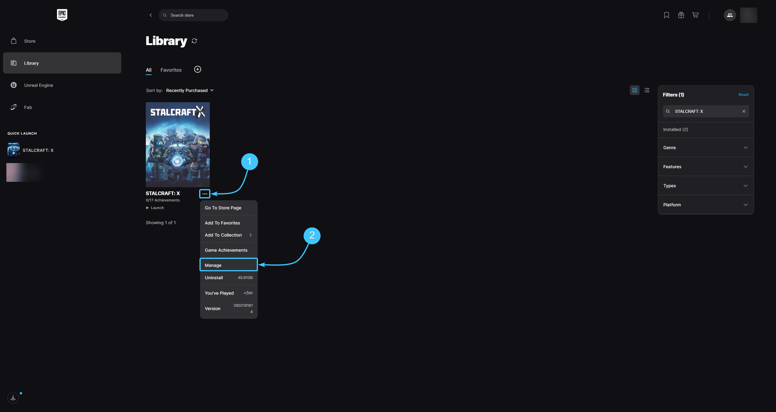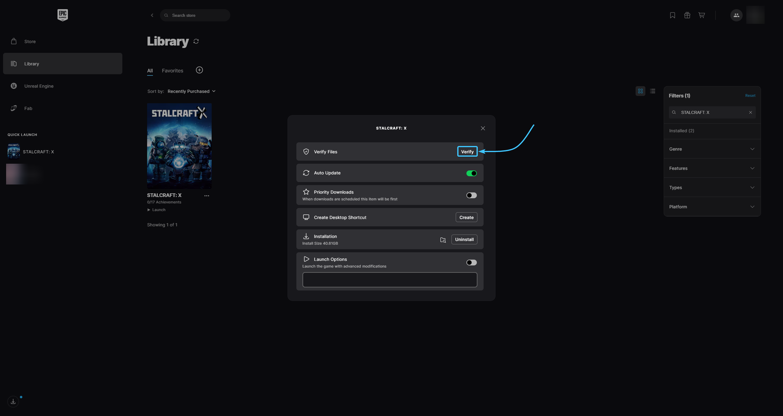 2. Click on the “Library” section on the left. Find the game STALCRAFT: X in the list.