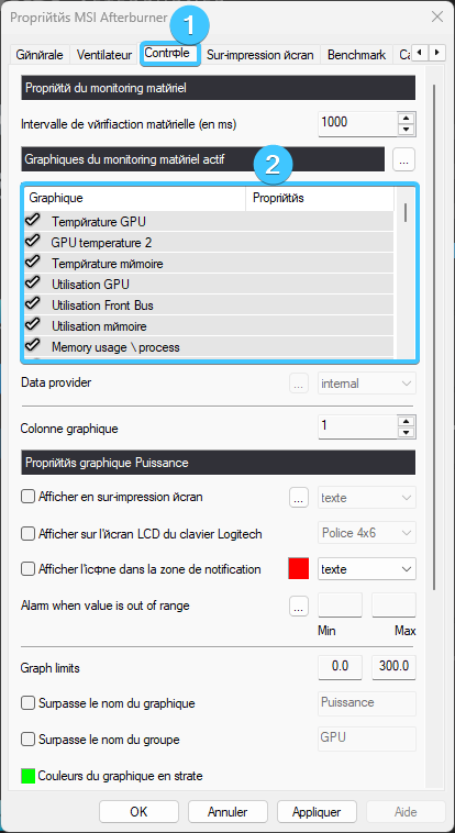 4. Ouvrez l'onglet Contrôle (1). Cochez toutes les cases blanches à côté de chaque paramètre (2).