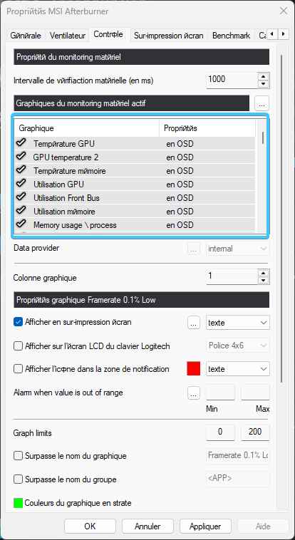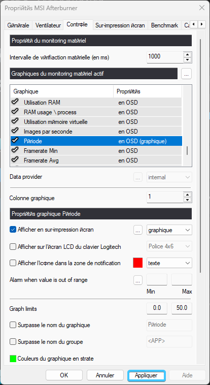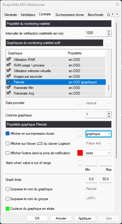 7. Sélectionnez le paramètre « Période » (Frame time). Dans la liste « Afficher en sur-impression écran », choisissez « graphique ».