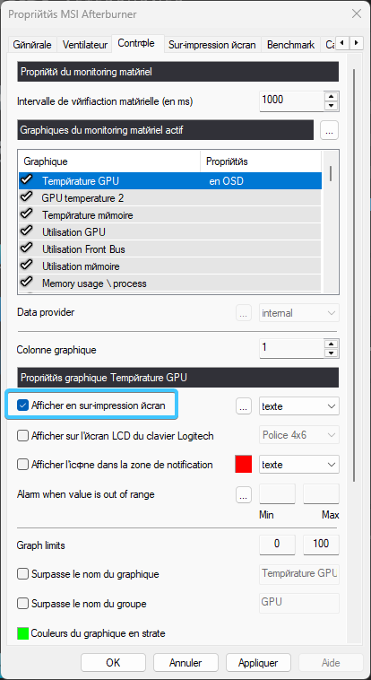 5. Sélectionnez le paramètre « Température GPU », puis cochez l'option « Afficher en sur-impression écran ».
