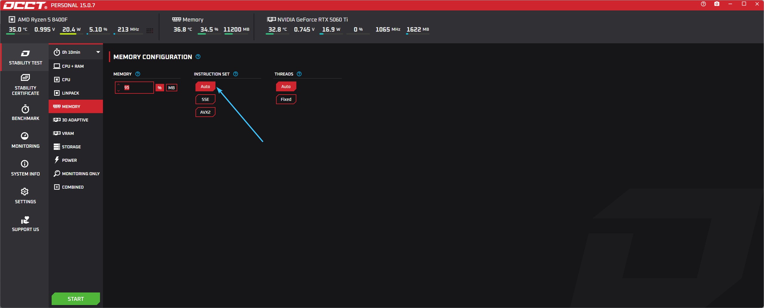 8. Dans le paramètre intitulé « INSTRUCTION SET », sélectionnez l’option « Auto » pour un test général.