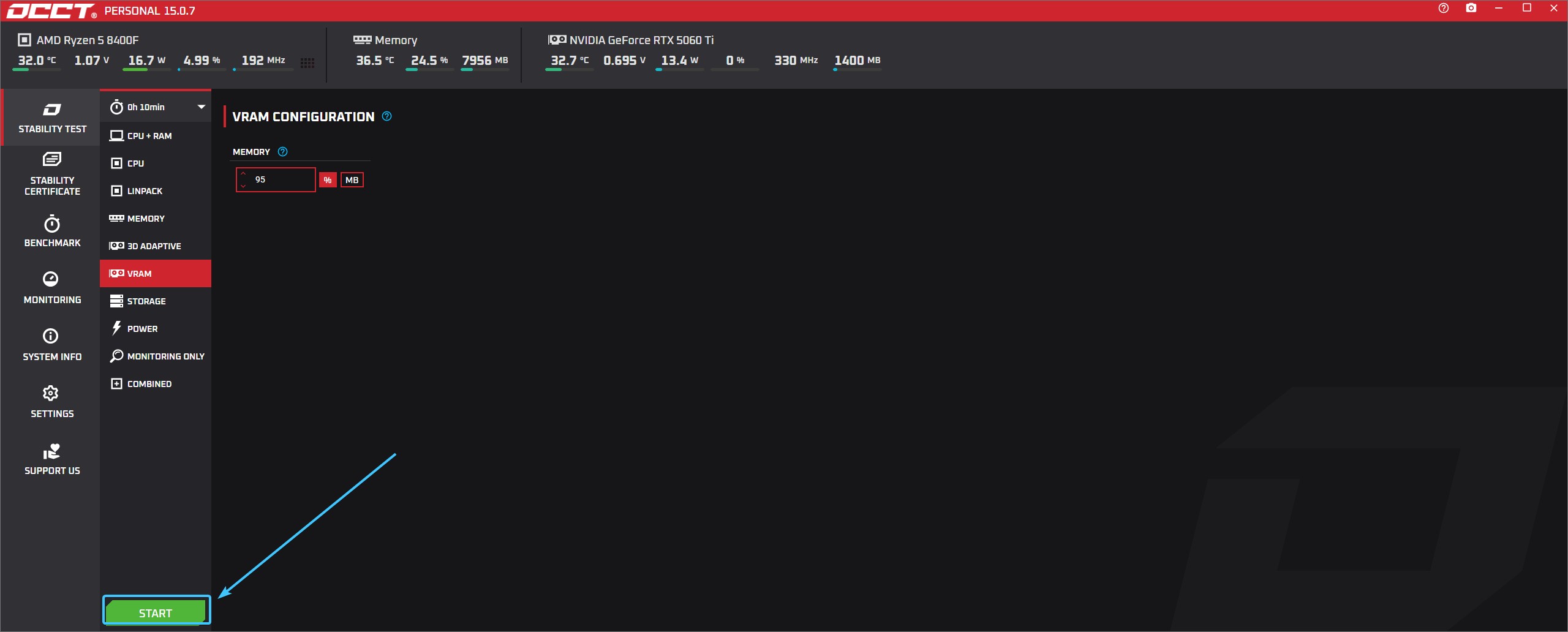 9. Pour démarrer le test, cliquez sur le bouton « Start » situé dans le coin inférieur gauche.