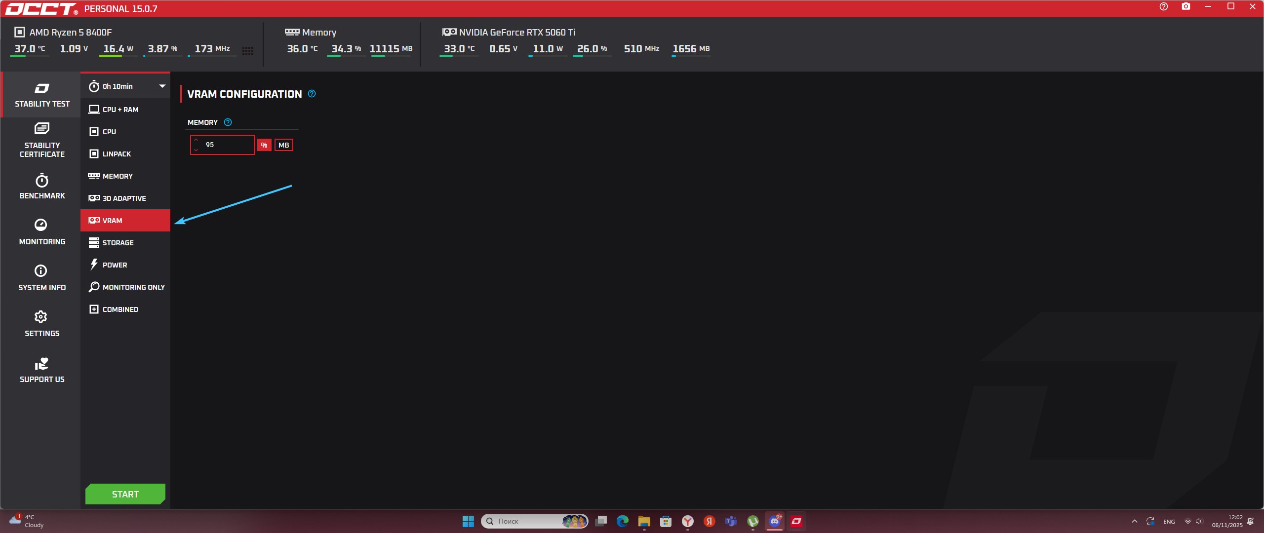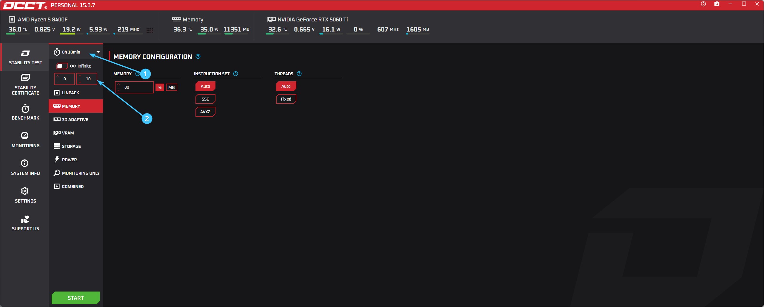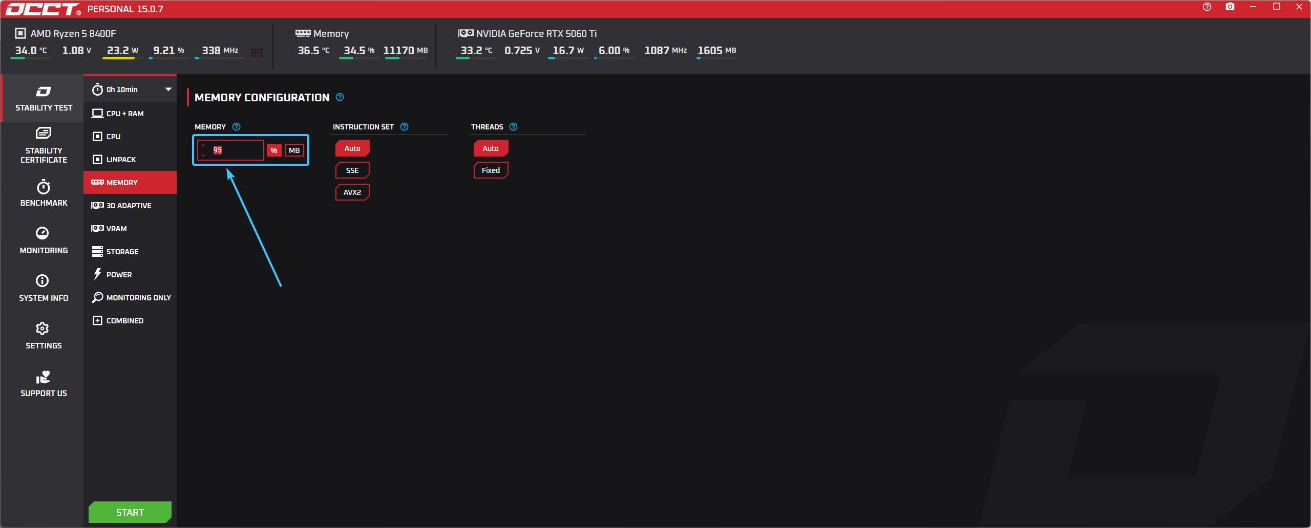 7. Dans le paramètre intitulé « MEMORY », réglez la valeur sur 95 % afin d’augmenter la charge sur la mémoire.