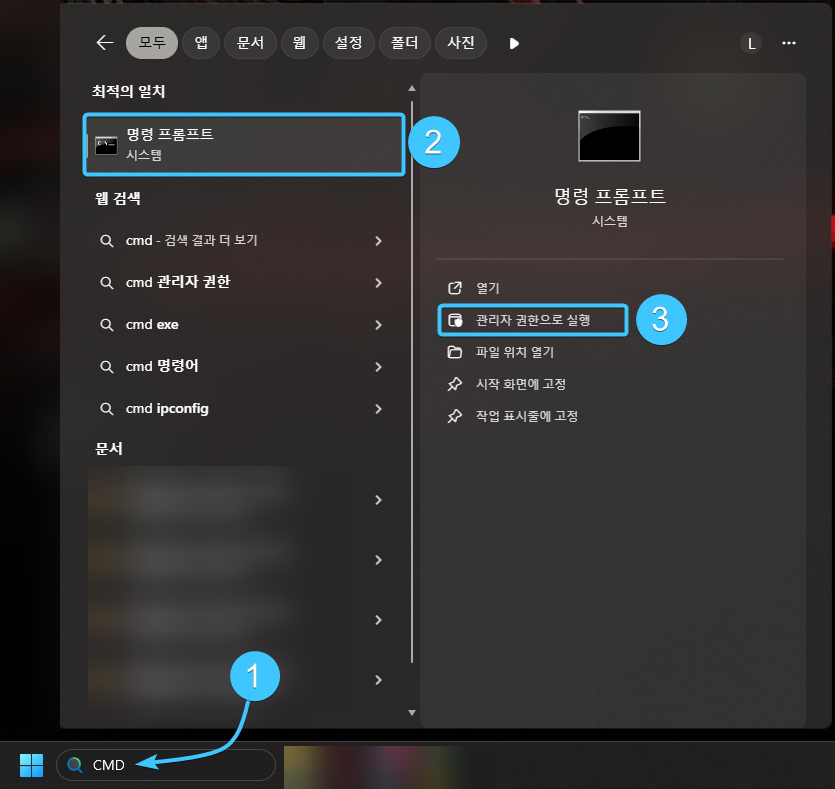 1. 검색을 통해 CMD를 찾아 관리자 권한으로 실행합니다.