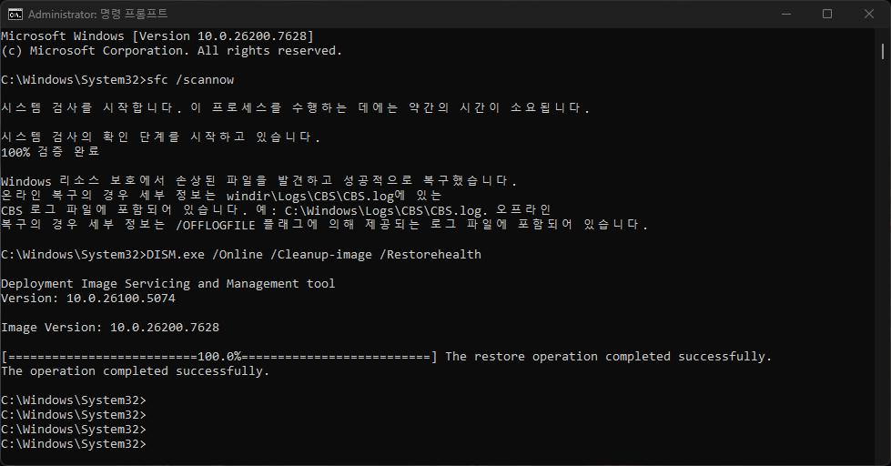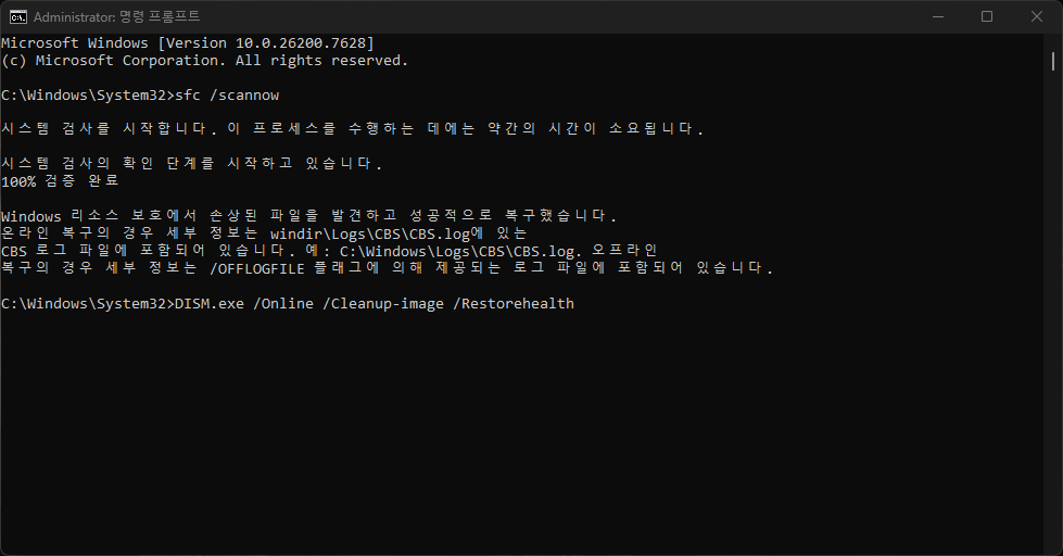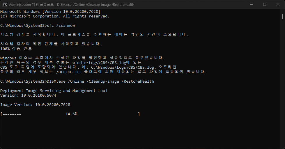 4. 검사 완료 후 DISM.exe /Online /Cleanup-image /Restorehealth 명령어를 입력합니다.