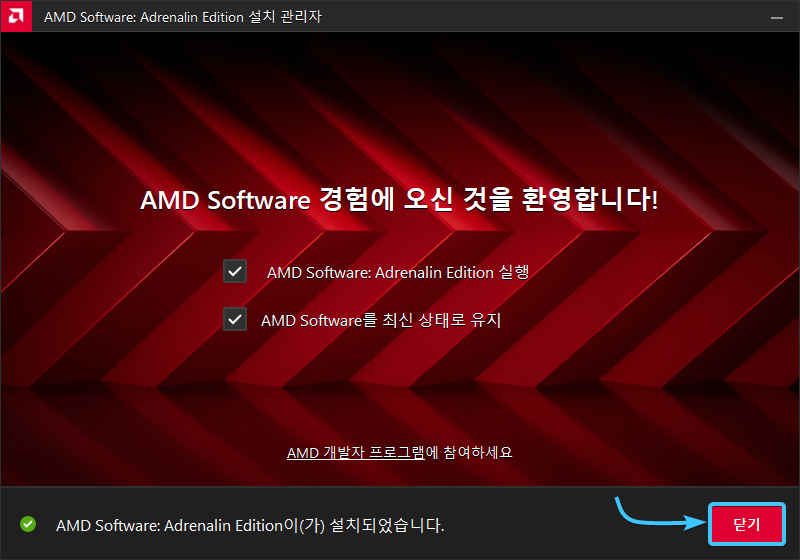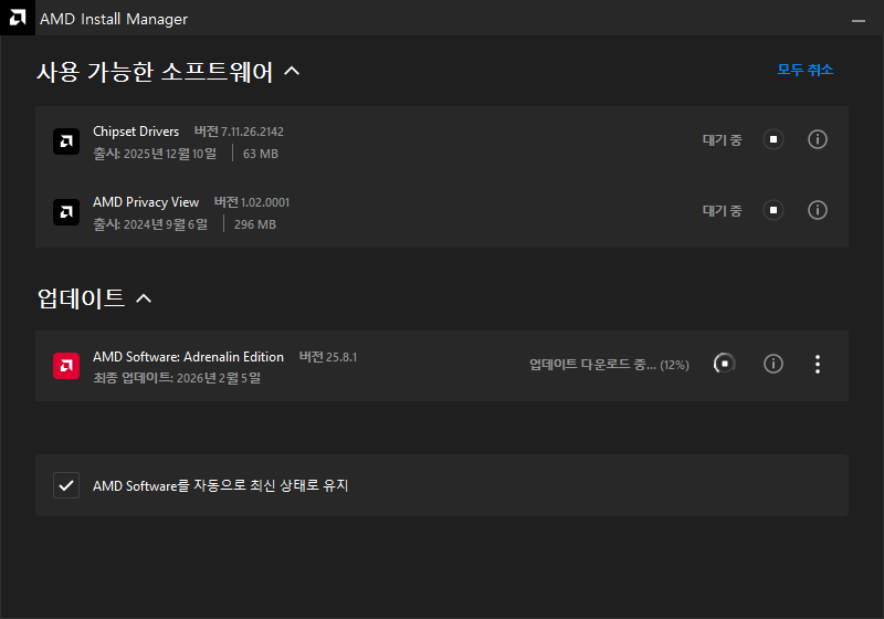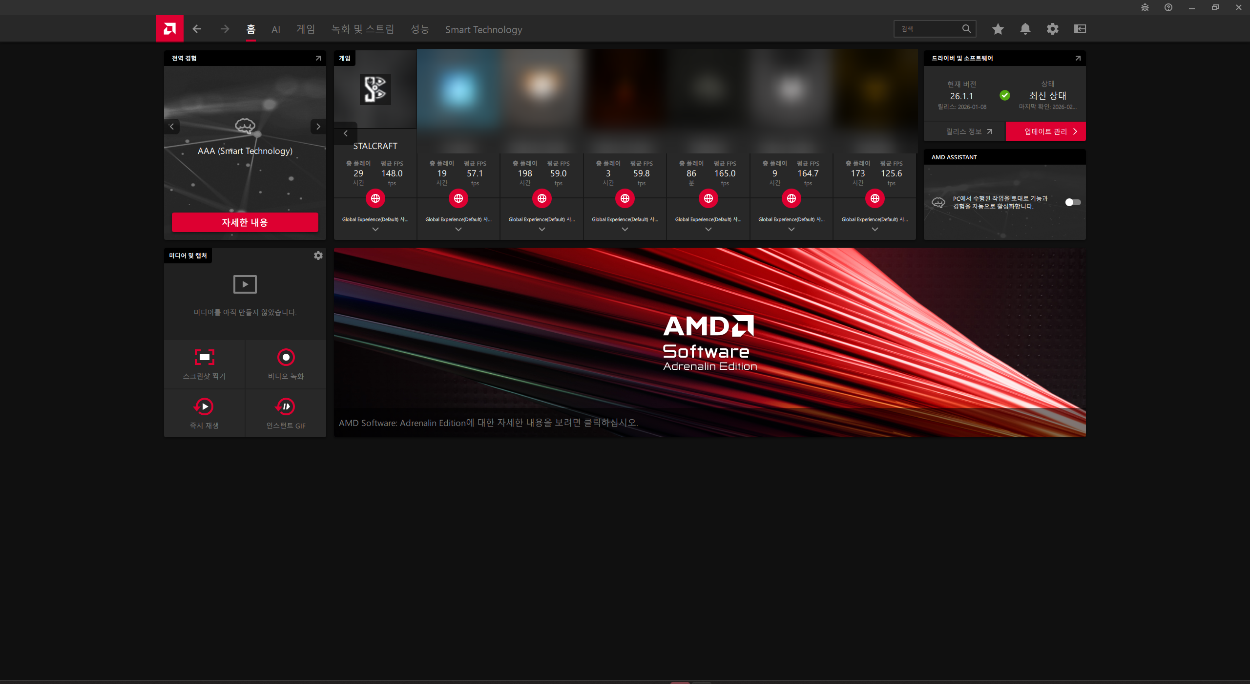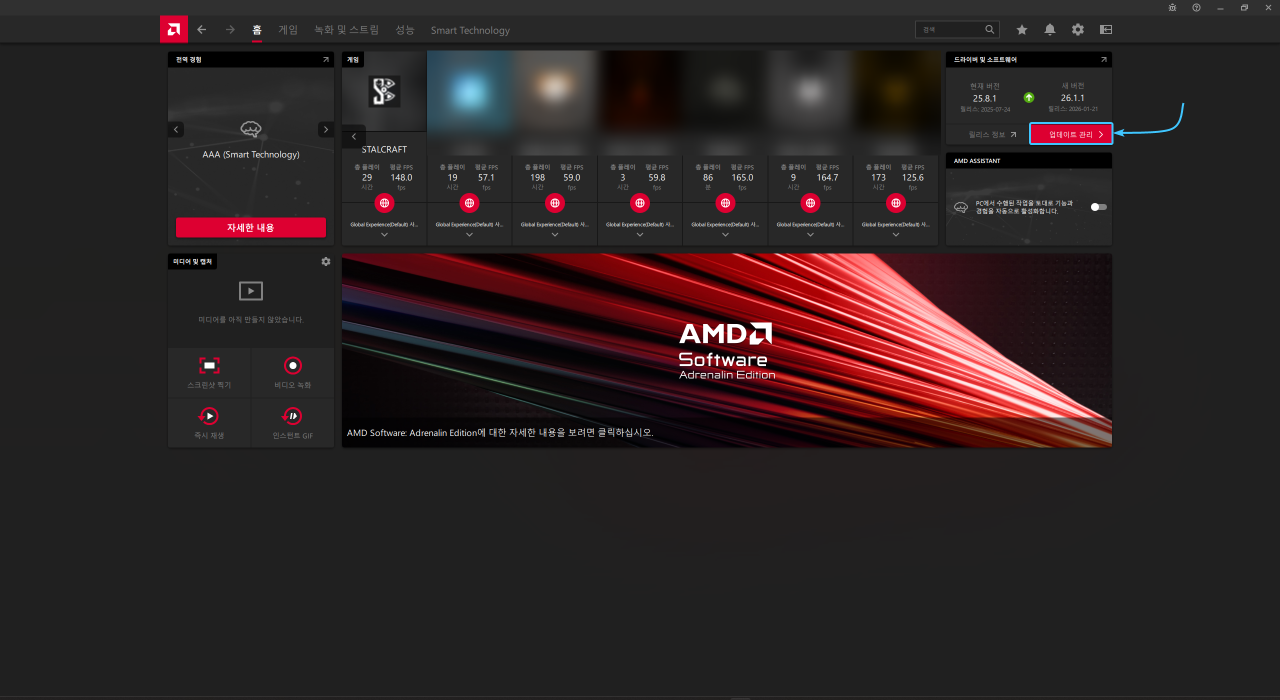 1. AMD Software: Adrenalin Edition 애플리케이션을 실행합니다. 실행하면 홈 탭이 바로 열리며, 업데이트 섹션은 애플리케이션 우측에 위치합니다.