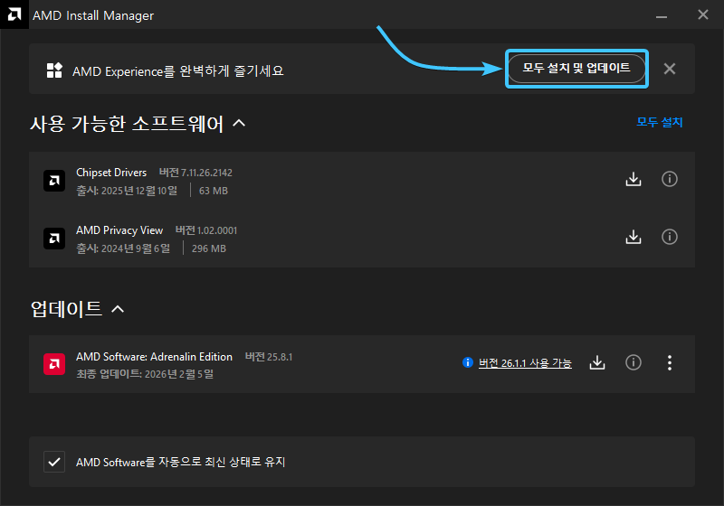 2. 사용 가능한 업데이트 창이 열리면 모두 설치 및 업데이트 버튼을 클릭합니다.