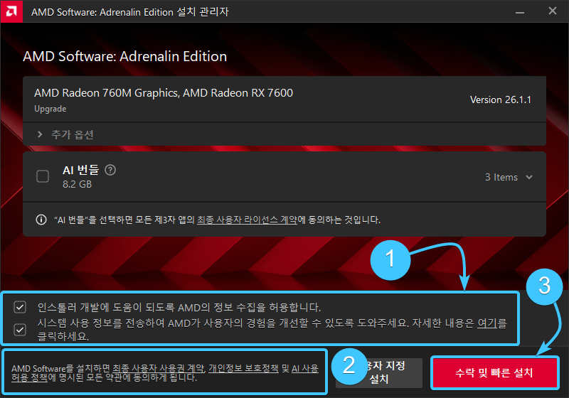 4. 원할 경우 정보 수집 옵션(1)에 체크 표시를 하고, 관련 문서(2)를 확인한 후 수락 및 빠른 설치 버튼을 클릭합니다 (3).