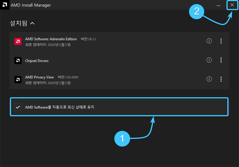 4. 자동 업데이트 설치 옵션(1)에 체크 표시한 후, 해당 창을 닫기(2) 버튼으로 닫습니다.