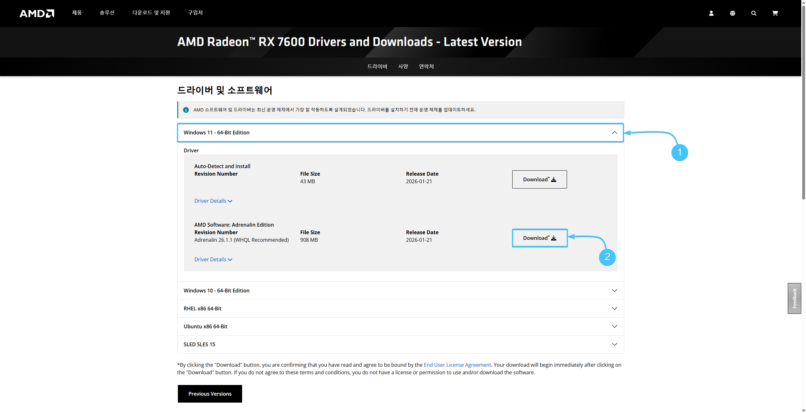 3. 사용 중인 Windows 버전에 해당하는 섹션(1)을 열고, Adrenalin 드라이버 옆에 있는 Download 버튼을 클릭합니다 (2).