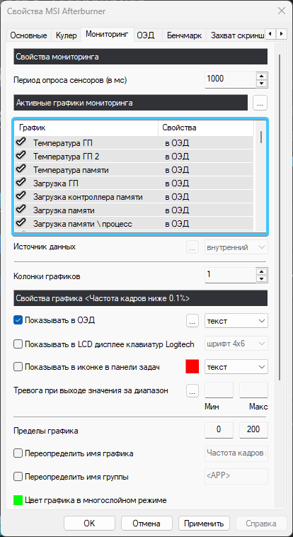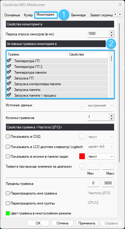4. Откройте вкладку «Мониторинг» (1). Выставите белые галочки возле каждого параметра (2).