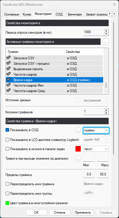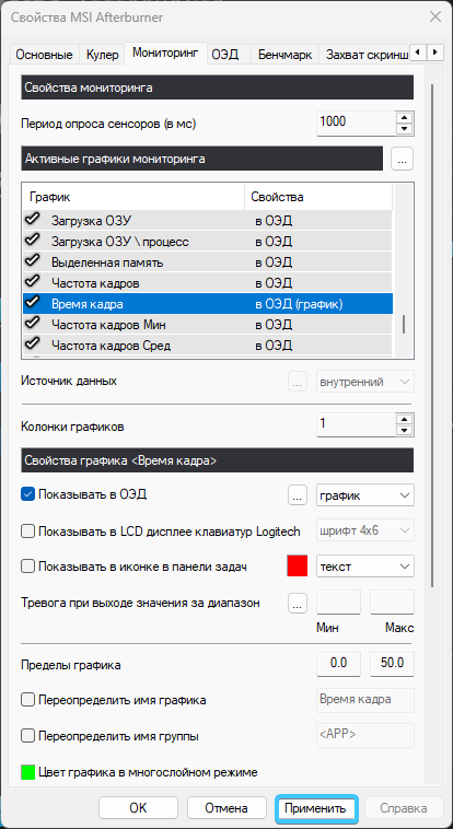 7. Выберите параметр «Время кадра». В списке «Показываться в ОЭД» выберите «График».