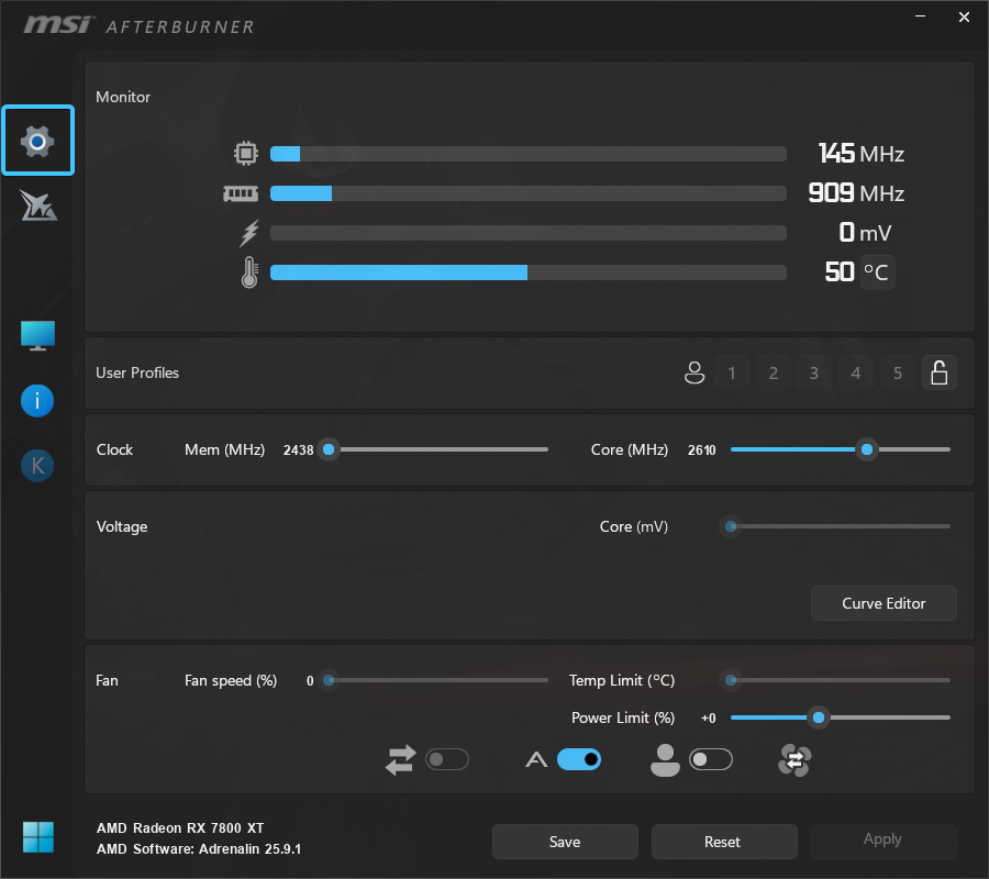 3. Запустите приложение «MSI Afterburner» и в меню слева нажмите на значок шестерёнки.