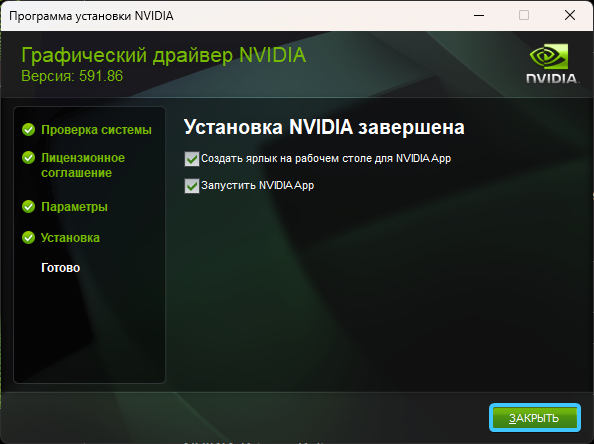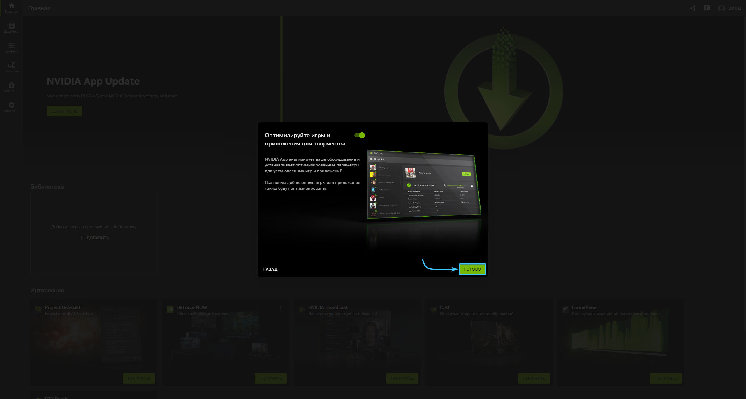 6. Появится предложение о включении оверлея «NVIDIA». Нажмите «Готово» для продолжения.