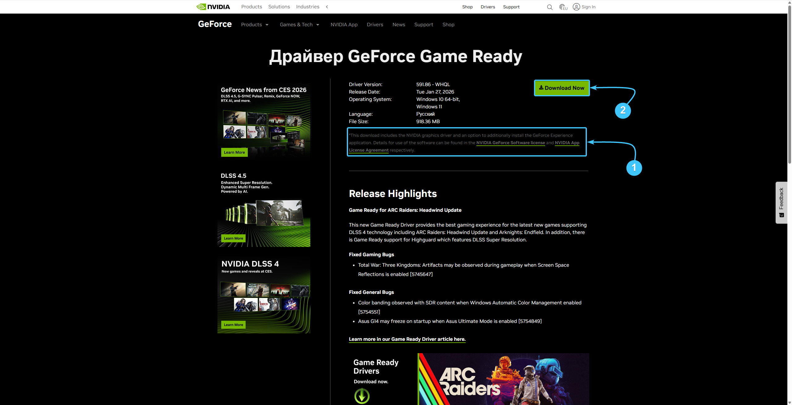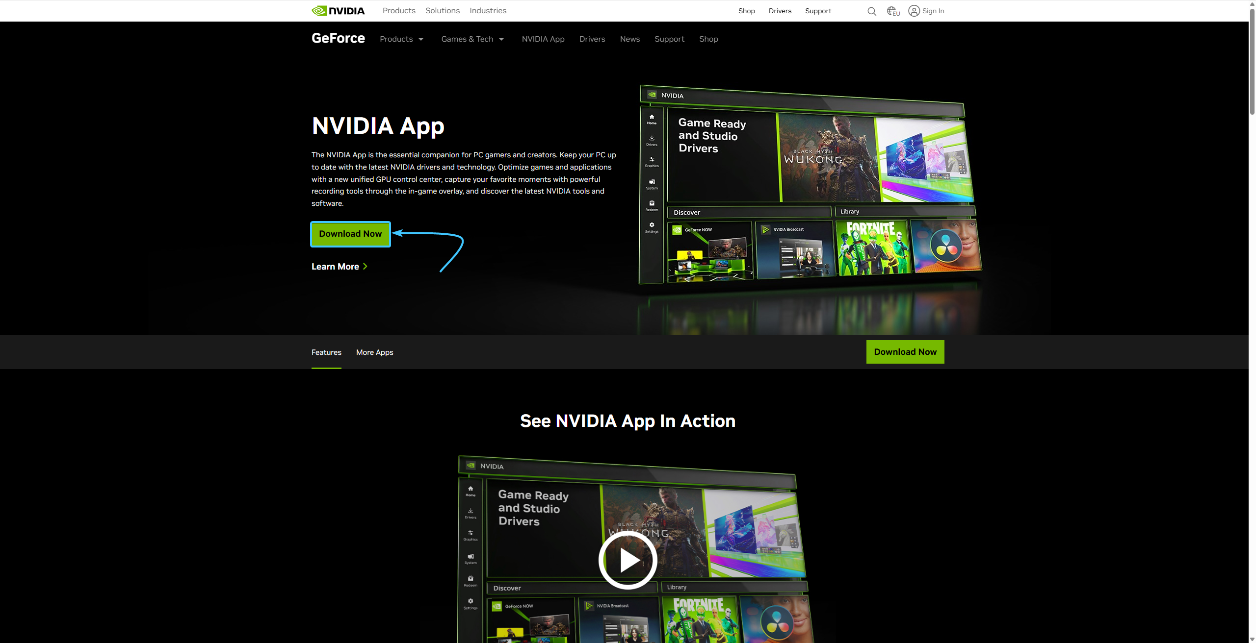 1. Перейдите на официальную страницу приложения «NVIDIA» и нажмите кнопку «Download Now».