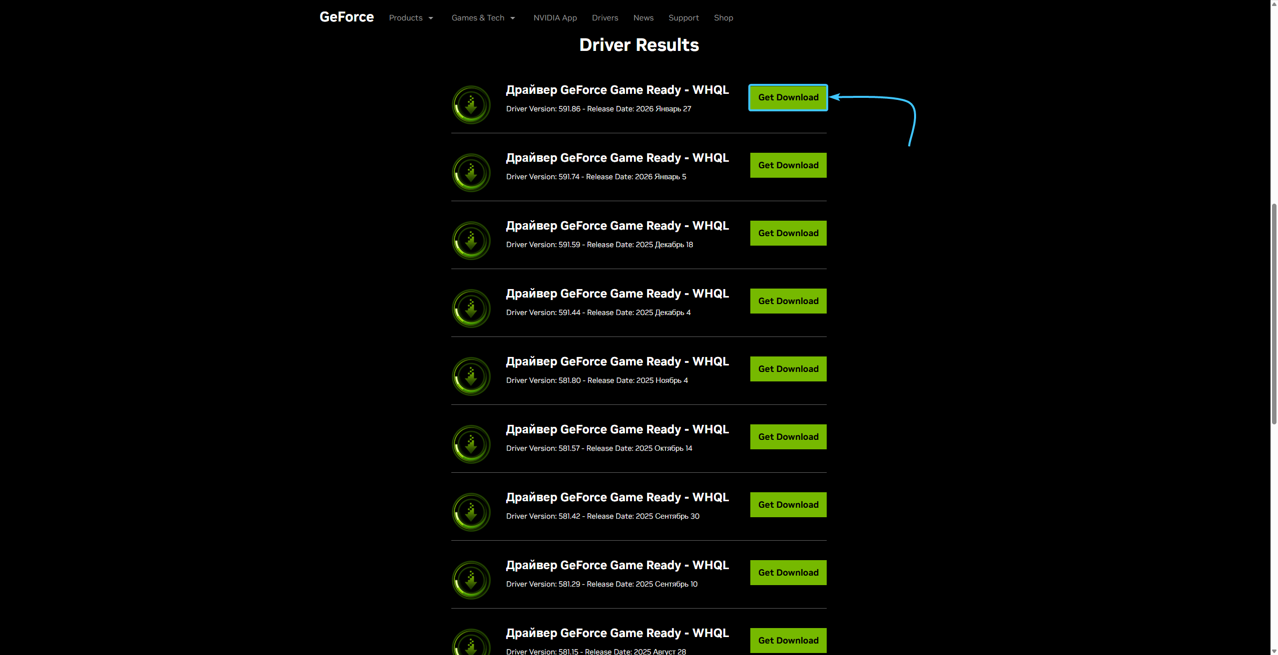 3. Сайт автоматически отыщет все драйверы. Справа от самого верхнего нажмите кнопку «Get Download».