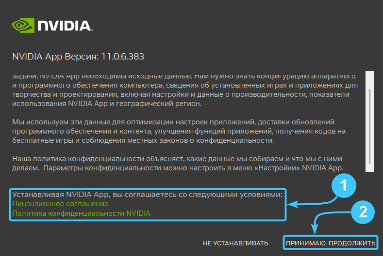 2. Запустите установщик. Ознакомьтесь с документами (1) и нажмите «Принимаю. Продолжить» (2).