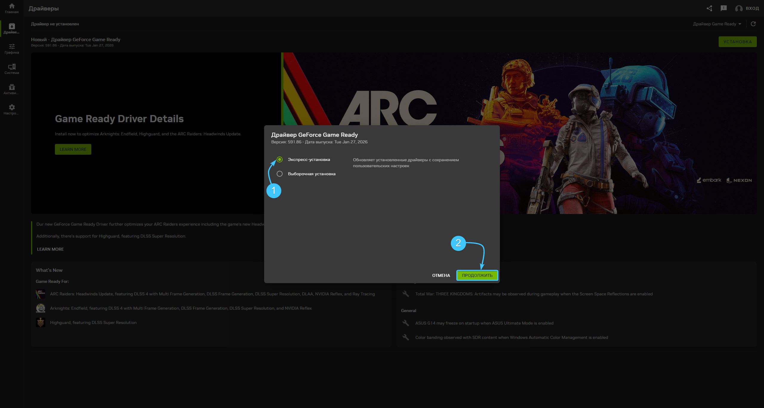 4. Выберите вариант «Драйвер Game Ready» (1) и нажмите кнопку «Далее» (2) для продолжения.