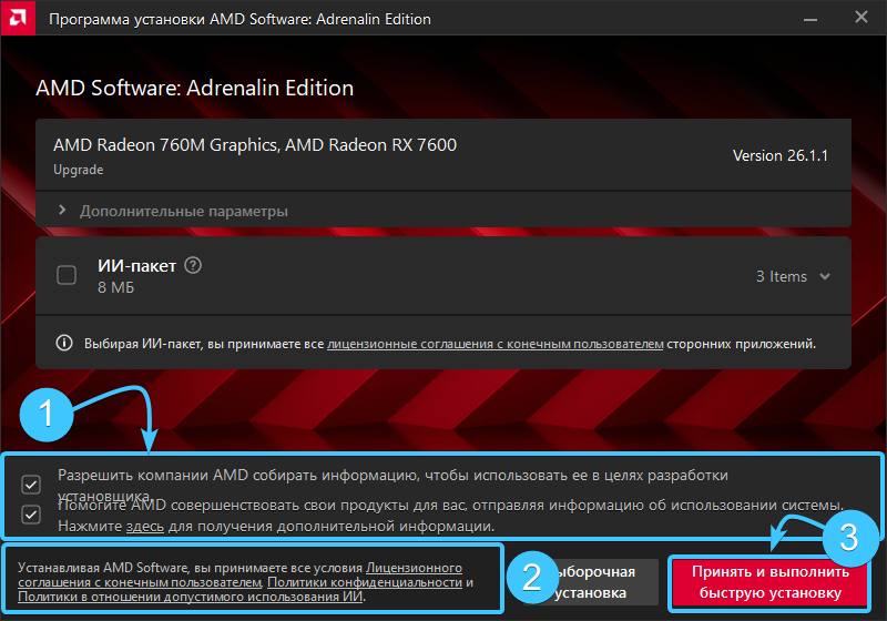 4. По желанию, поставьте галочки для сбора информации (1), онакомьтесь с действующими документами (2) и нажмите кнопку «Принять и выполнить быструю установку» (3).