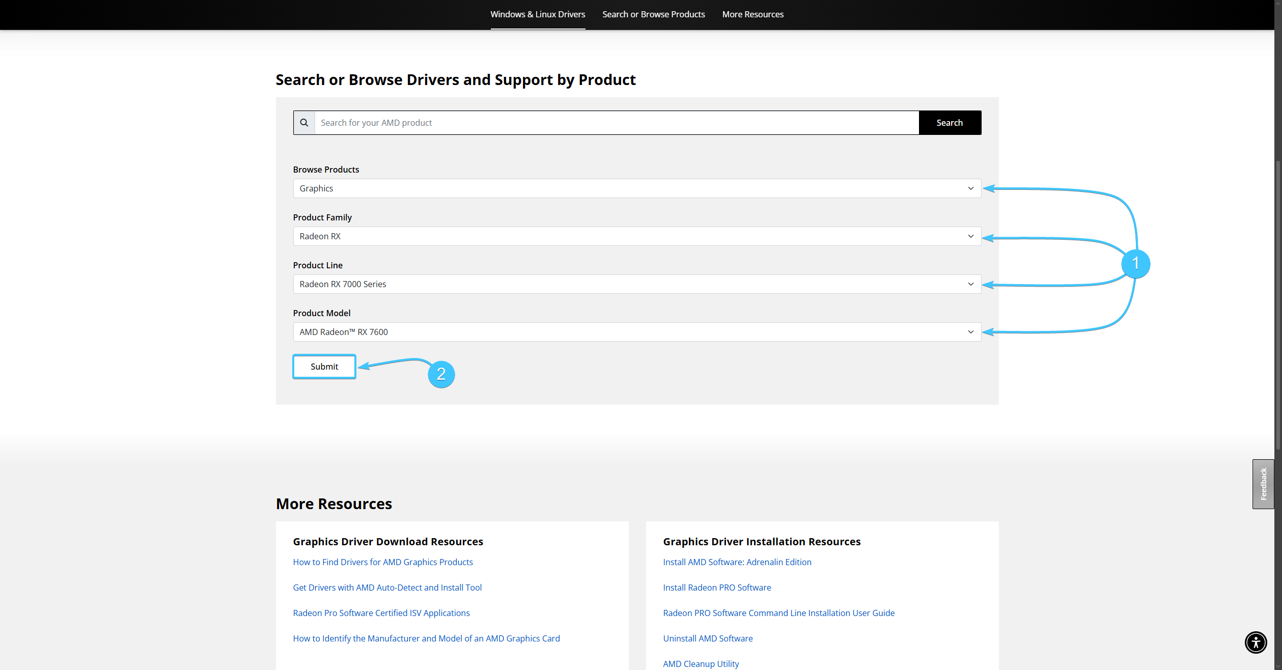2. В списке снизу выберите «Graphics» и данные вашей видеокарты (1). Определить семейство, серию и модель видеокарты можно через «Диспетчер устройств». После нажмите кнопку «Submit» (2).