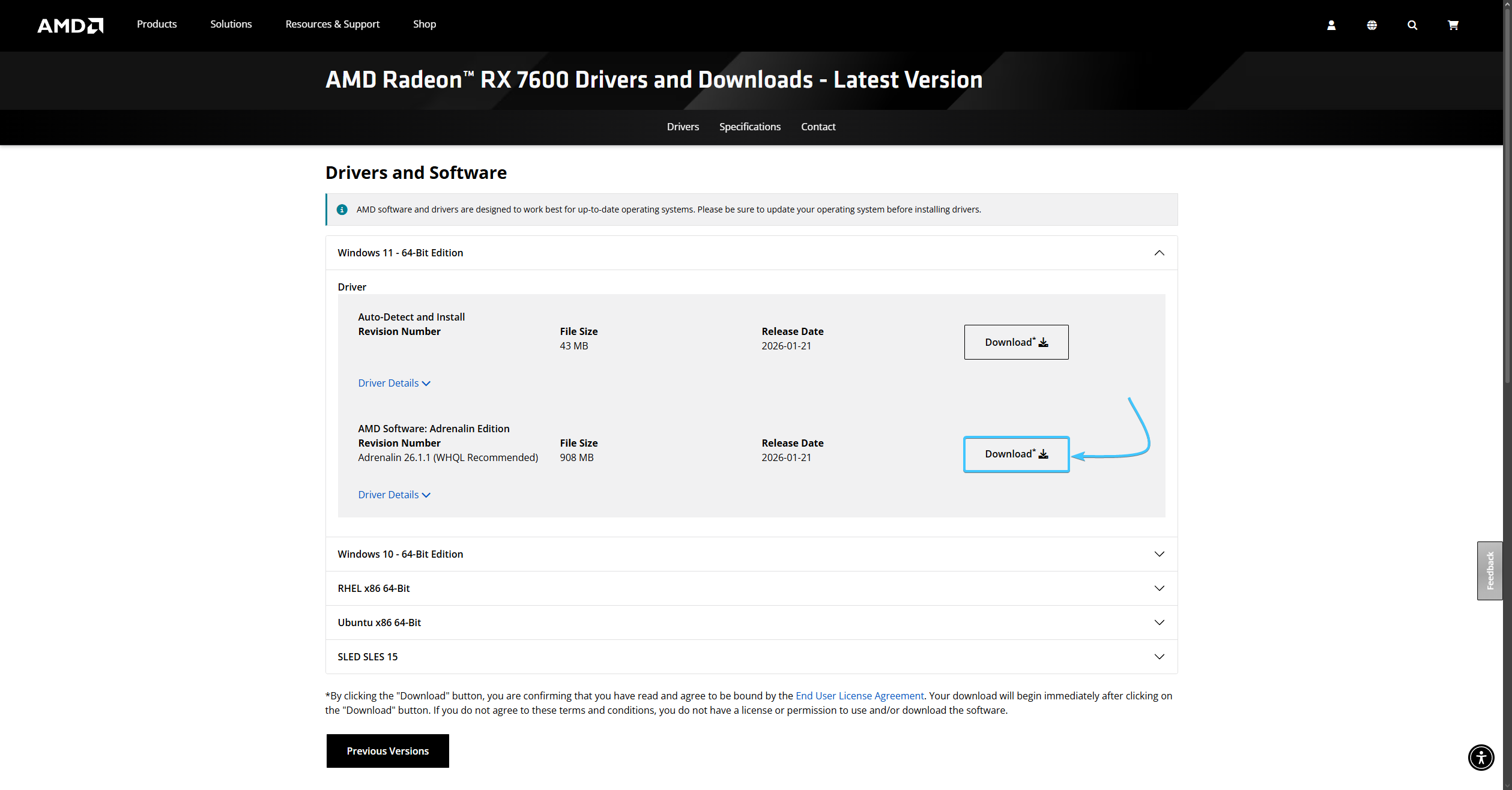 3. Откройте раздел с вашей версией «Windows» (1). Возле «Adrenalin» драйвера нажмите «Download» (2).