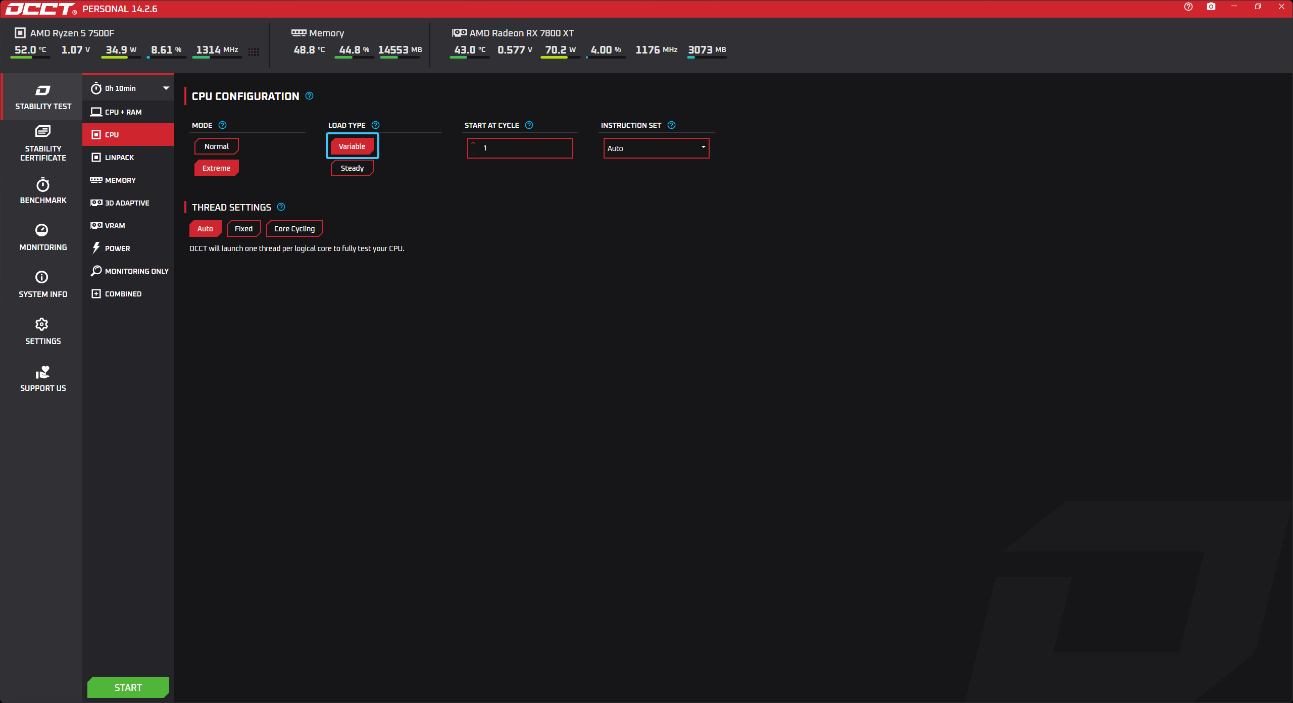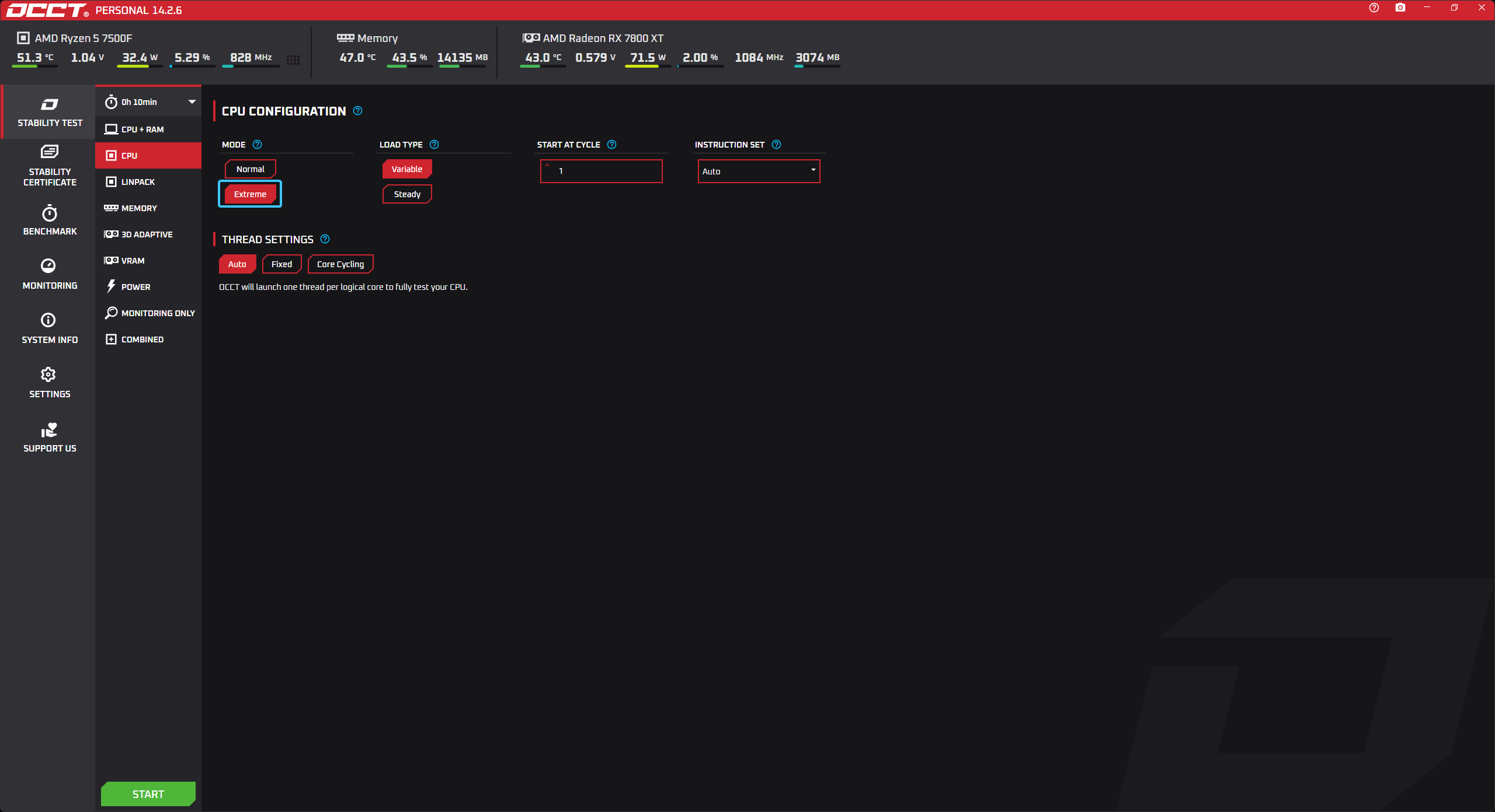 В параметре под названием «LOAD TYPE» выберите вариант «EXTREME» для тщательного теста.