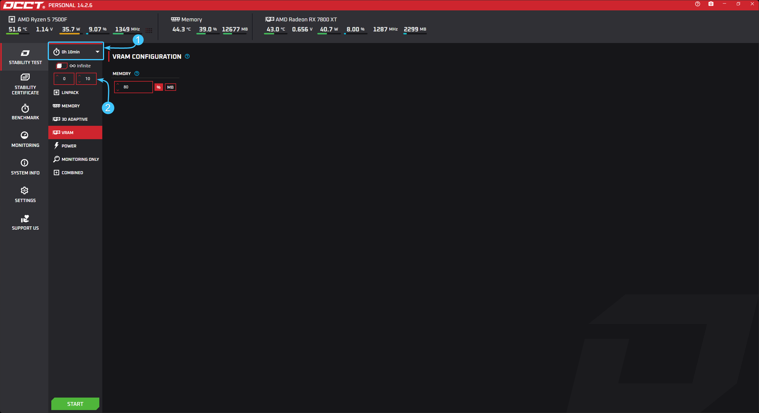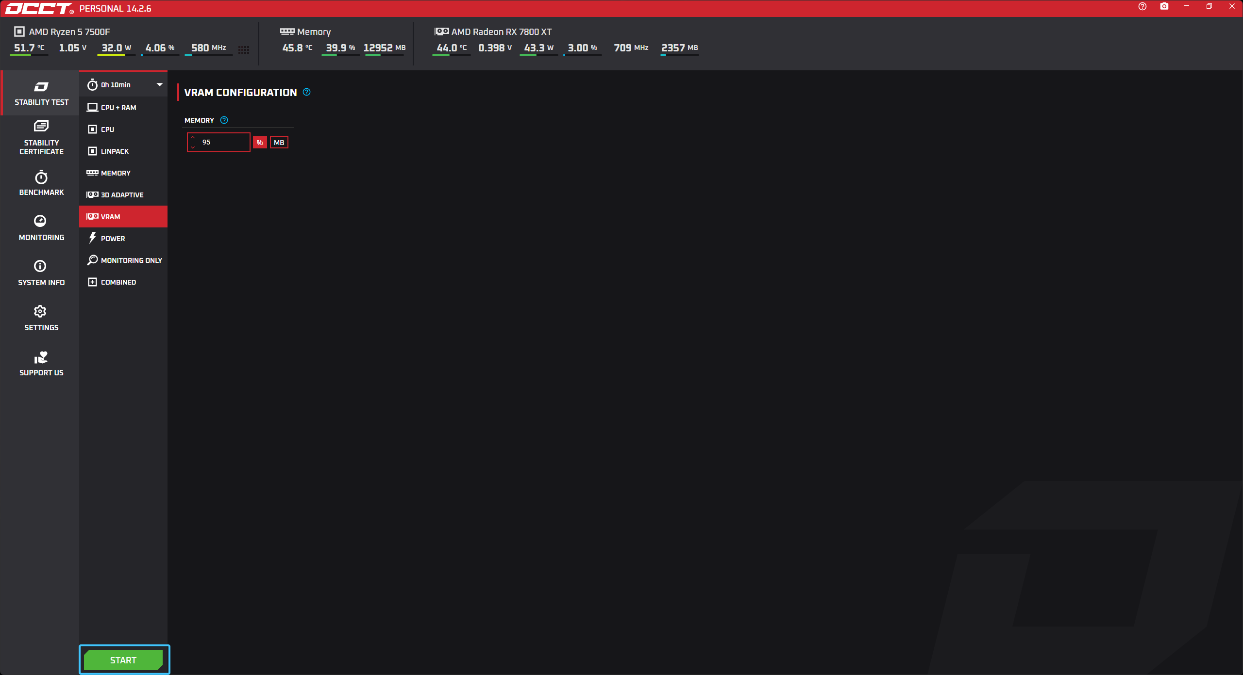 3. Для запуска тестирования нажмите кнопку «Start», которая расположена в левом нижнем углу.