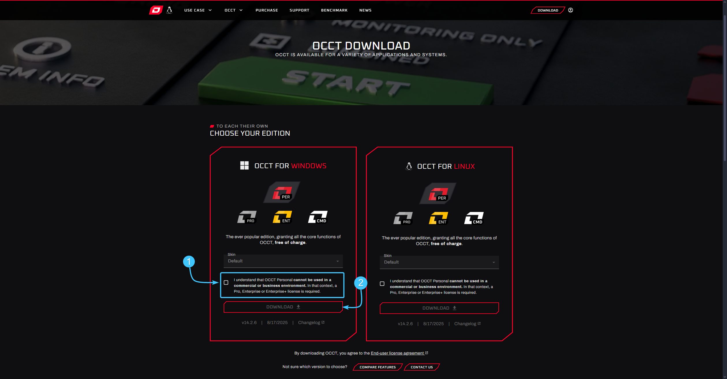 2. Ознакомьтесь с информацией и поставьте галочку согласия (1). Затем нажмите кнопку «Download» (2).