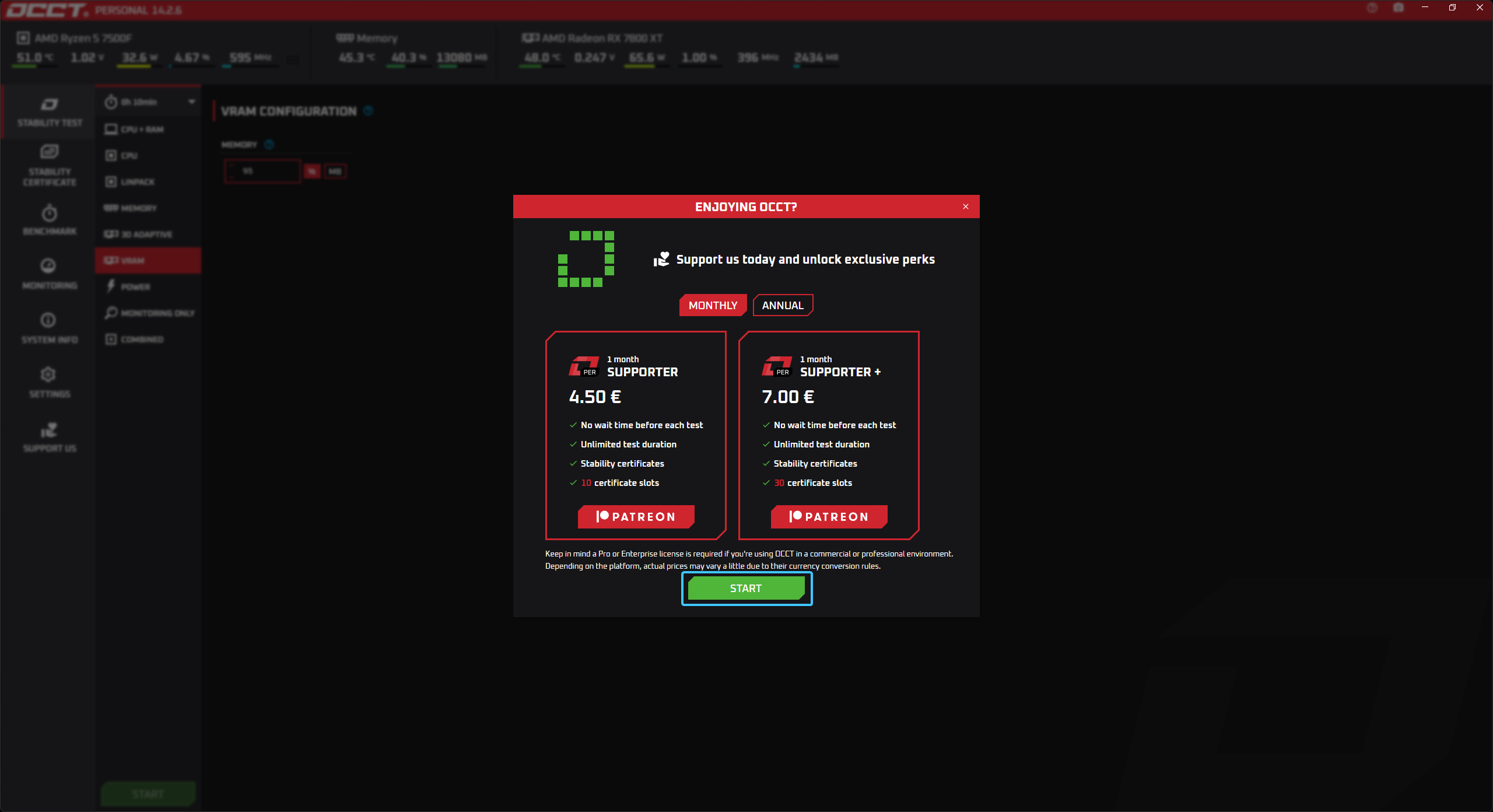 4. Появится окно поддержки. Обратите внимание, что финансовая поддержка для использования данного приложения в личных целях не обязательна. Вновь нажмите кнопку «Start» для запуска.