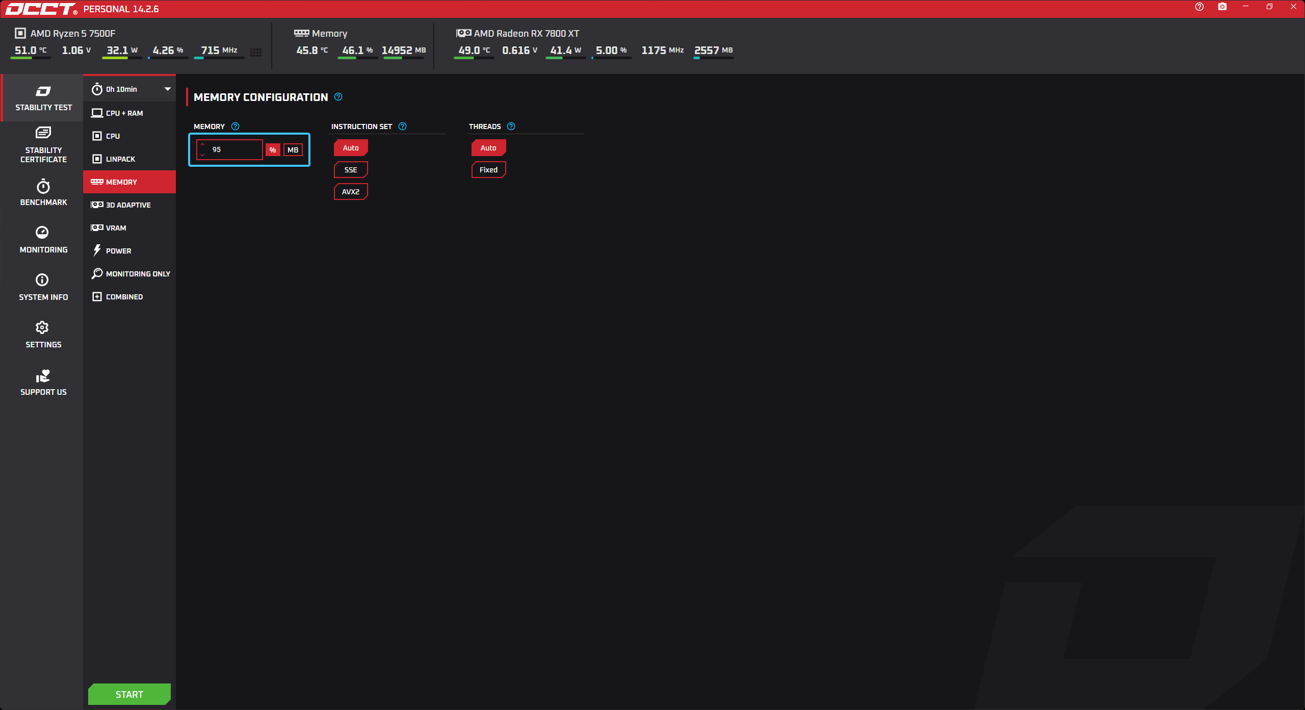 В параметре под названием «MEMORY» выставите значение «95%» для большей нагрузки на память.